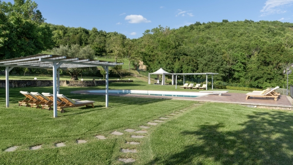 A circa 50 metri dal casale, si trova la grande e panoramica piscina rettangolare. Misurando ben 6x14 metri con una profondità che varia da 0.90 m a 2.90 m, è l'ideale sia per un tuffo rinfrescante che per nuotare. L'accesso è facilitato da gradoni sommersi e trampolino, mentre l'illuminazione interna ed esterna la rende perfetta anche per un bagno serale.
